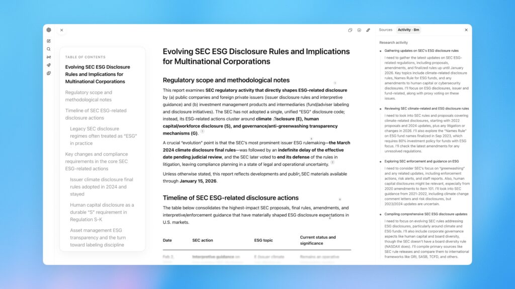 O grande destaque é a substituição dos modelos anteriores pelo GPT-5.2, que traz melhorias significativas na qualidade e precisão dos relatórios gerados. Estes relatórios, que podem demorar entre 5 e 30 minutos a ser criados, incluem citações detalhadas e agora ficam ainda mais confiáveis.